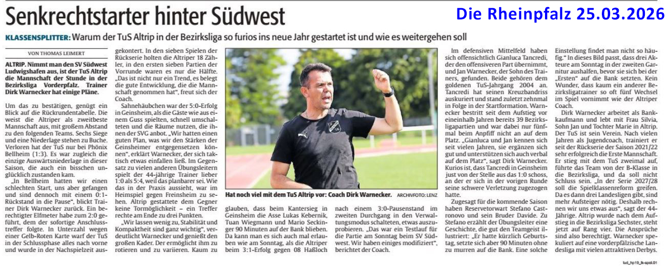 Der TuS Altrip hat die Saison 2025/26 in der VICTOR BVRP Bezirksliga auf einem respektablen 5. Platz von insgesamt acht Mannschaften abgeschlossen. Mit 10:18 Punkten aus 14 Spielen (3 Siege, 4 Unentschieden, 7 Niederlagen) positionierte sich das Team im Mittelfeld der Tabelle.