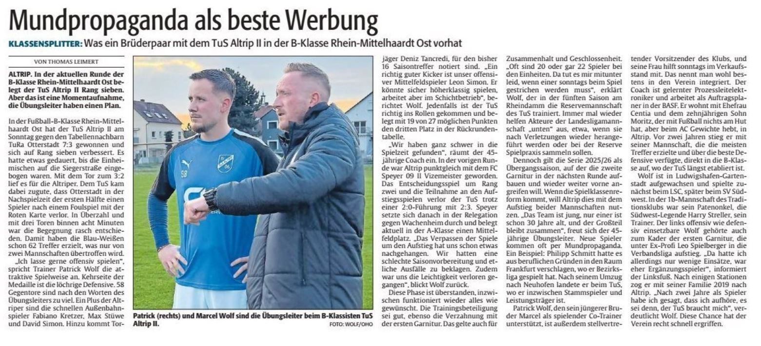 Zu unserer 2. Mannschaft siehe auch Artikel Mundpropaganda als beste Werbung der lokalen Presse „Die Rheinpfalz“ vom 16.04.2026